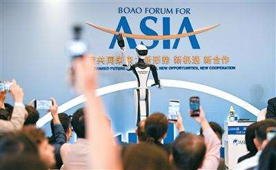 博鳌亚洲论坛二〇二六年年会期间,多元智能设备全方位护航盛会运行,以科技力量赋能智慧办会。图为在年会分论坛上参与互动的人形机器人。