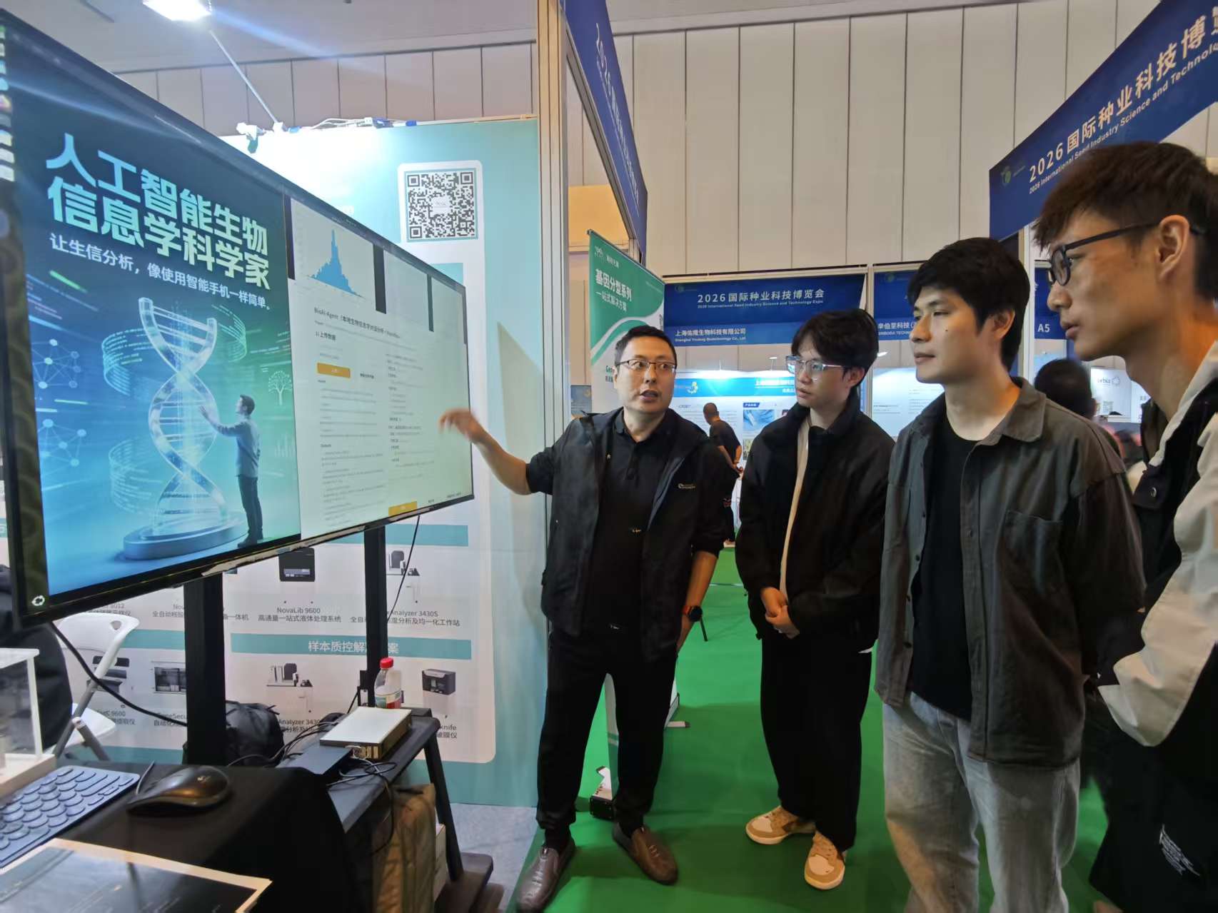 1月15日,在三亚国际种业科学家大会国际种业科技博览会上,海南大学三亚南繁研究院副院长夏志强(左一)向观众介绍“人工智能生物信息学科学家系统”。(图片来源:中新社)