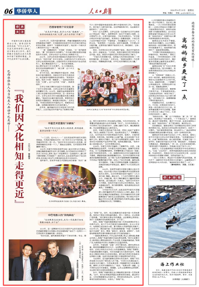 中国和巴西日前发布联合公告,宣布2026年共同庆祝“中巴文化年”,引发巴西华侨华人热议。在日常生活工作中,旅巴侨胞与当地民众在文化相知中结下深厚的情谊,为中巴友好写下生动注脚。