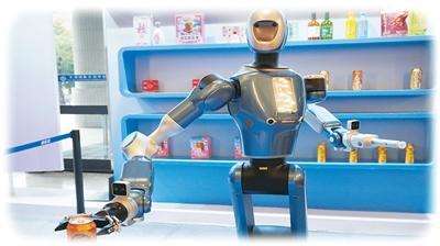 “您的商品准备好了,请给我一个好评哦。”推介会会场外,服务型机器人在货架间穿梭自如,机械臂精准抓取麻糖、米酒等特色“荆楚风味”,送到采访团手中。
