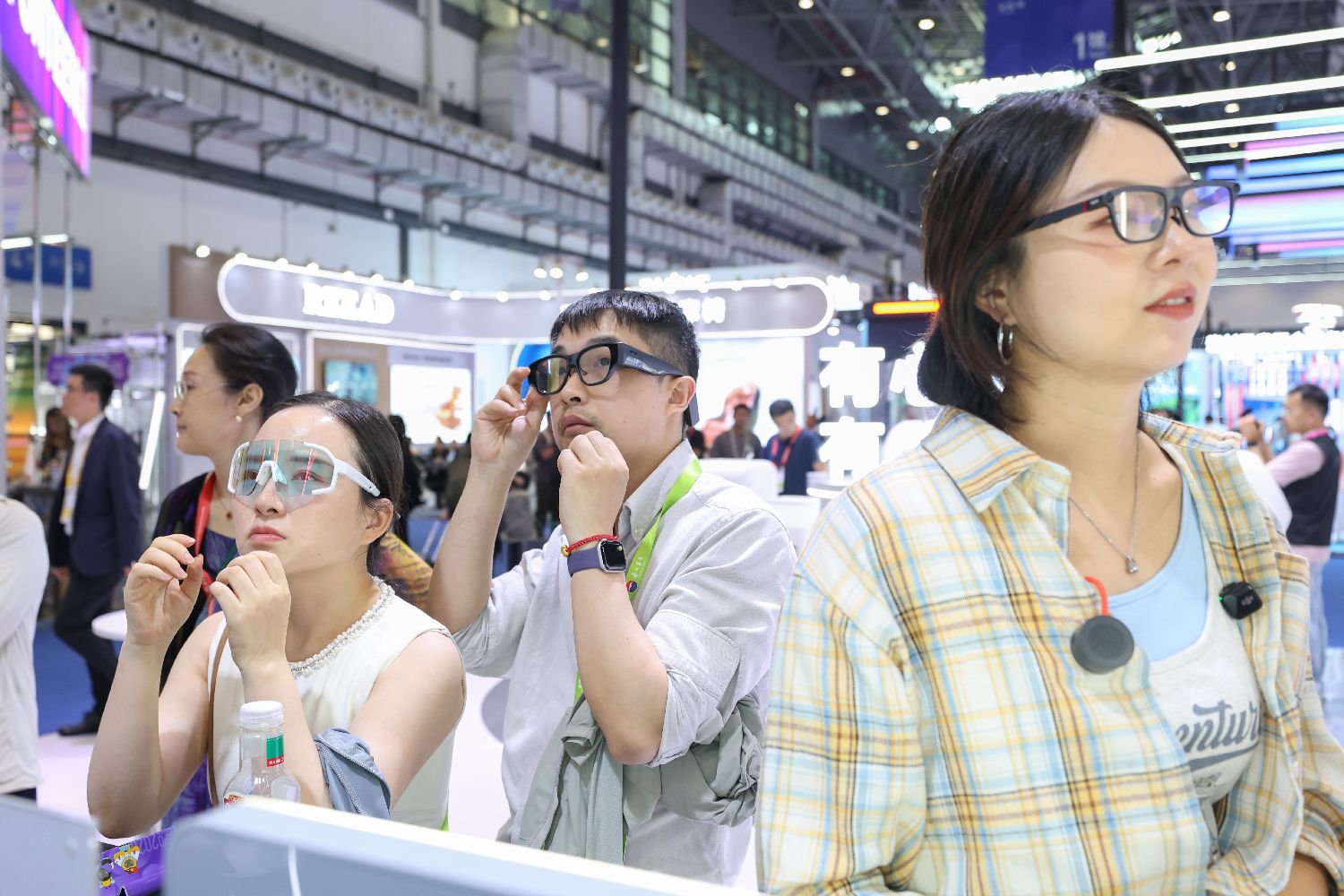 4月14日,在第六届中国国际消费品博览会上,参观者在试戴多种款式的AI眼镜。(图片来源:中新社)