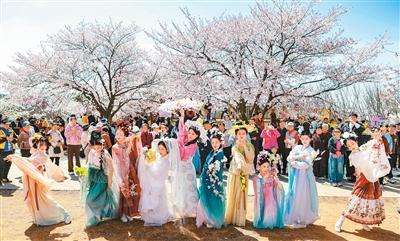 游客在山东省威海市威海植物园赏樱花并观看汉服表演。