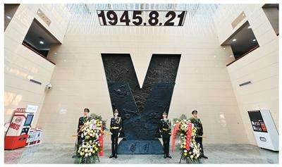 图为与会人员向中国人民抗战胜利受降纪念馆内的胜利V字雕塑献花。