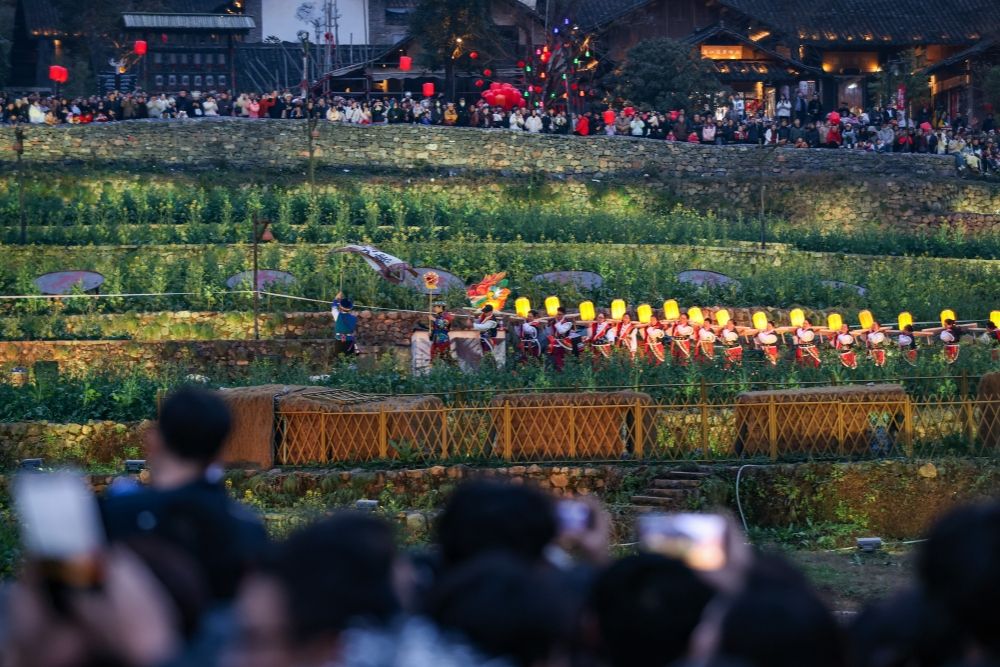 2月18日晚,乌江寨板凳龙表演吸引民众观看。春节期间,位于贵州省遵义市播州区的乌江寨国际旅游度假区举行“寨里烟火年”系列活动,吸引不少民众前来参与,并在系列演绎及体验活动中乐享假日时光。(图片来源:中新社)
