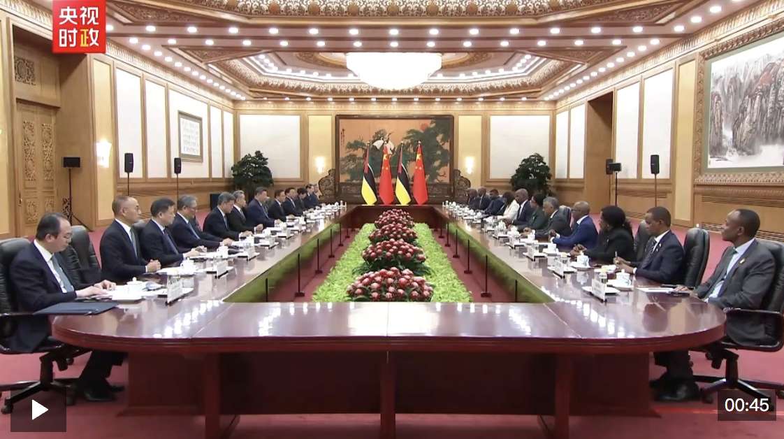 4月21日下午,国家主席习近平在北京人民大会堂同来华进行国事访问的莫桑比克总统查波举行会谈。